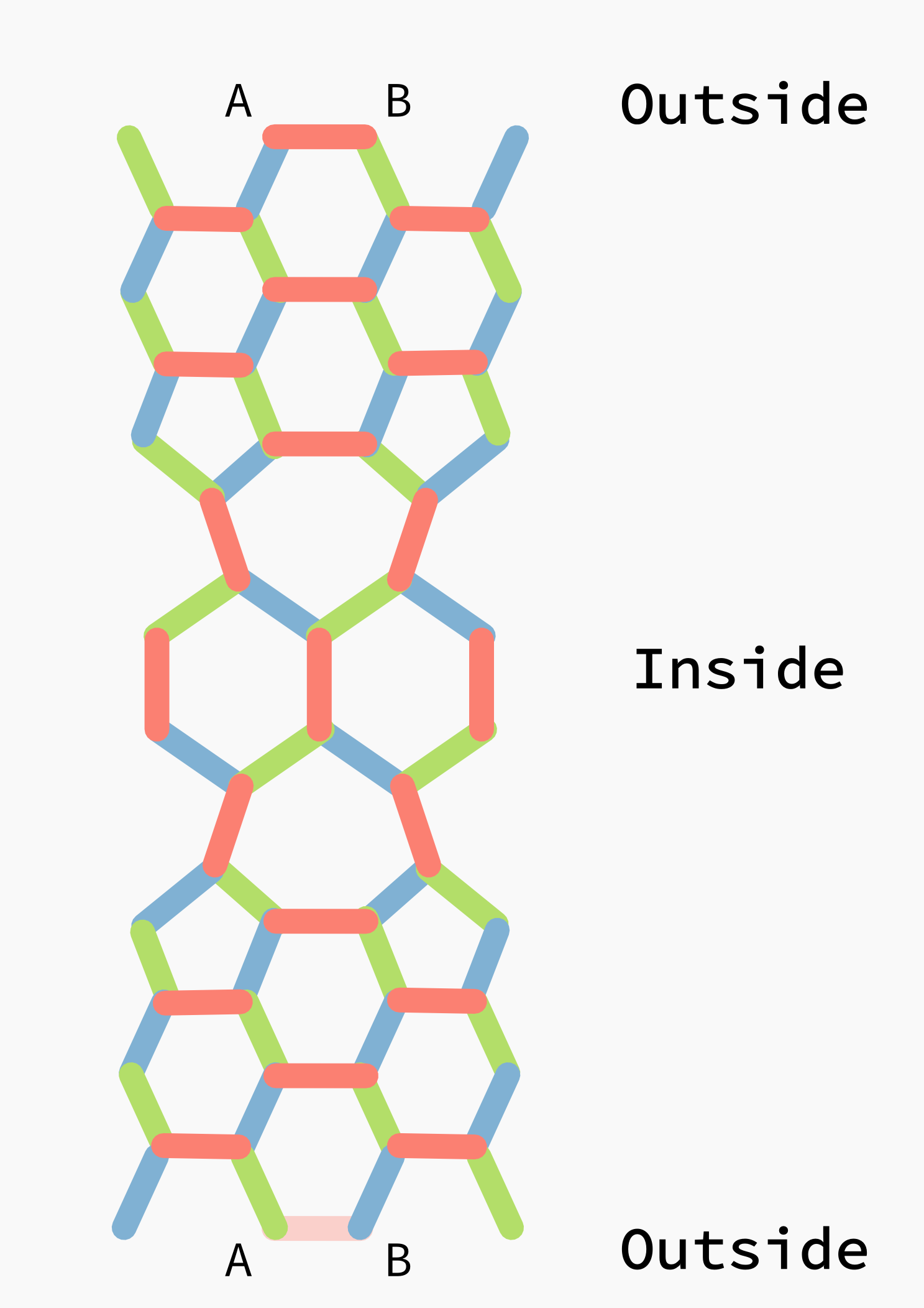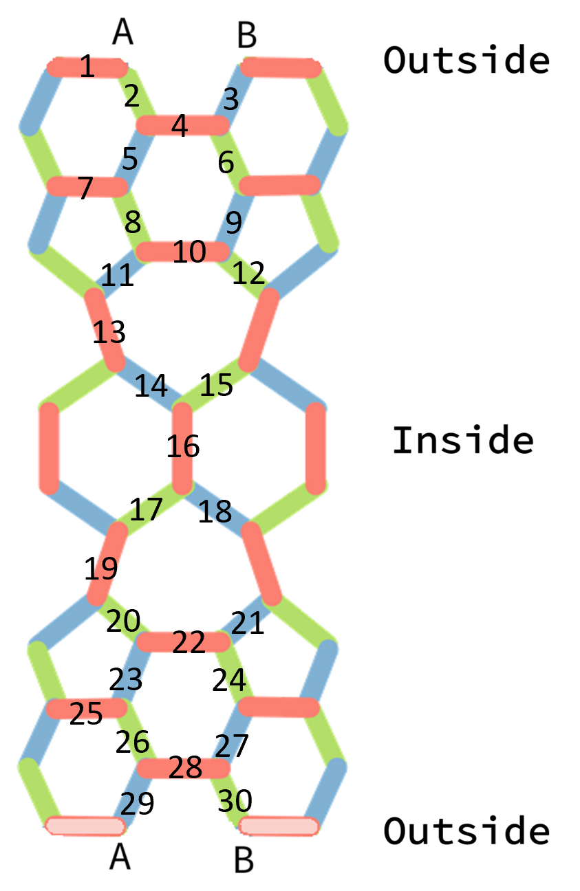 The graph which is formed by the individual PHiZZ units is a 3-regular graph, in that each vertex has exactly 3 edges leaving it, so we know that it can be edge colored in at most 4 colors. To find the 3 coloring I folded a test one (yeah, an entire test torus out of just regular printer paper..), labeled the vertices / edges, and worked out the graph on a sheet of paper.