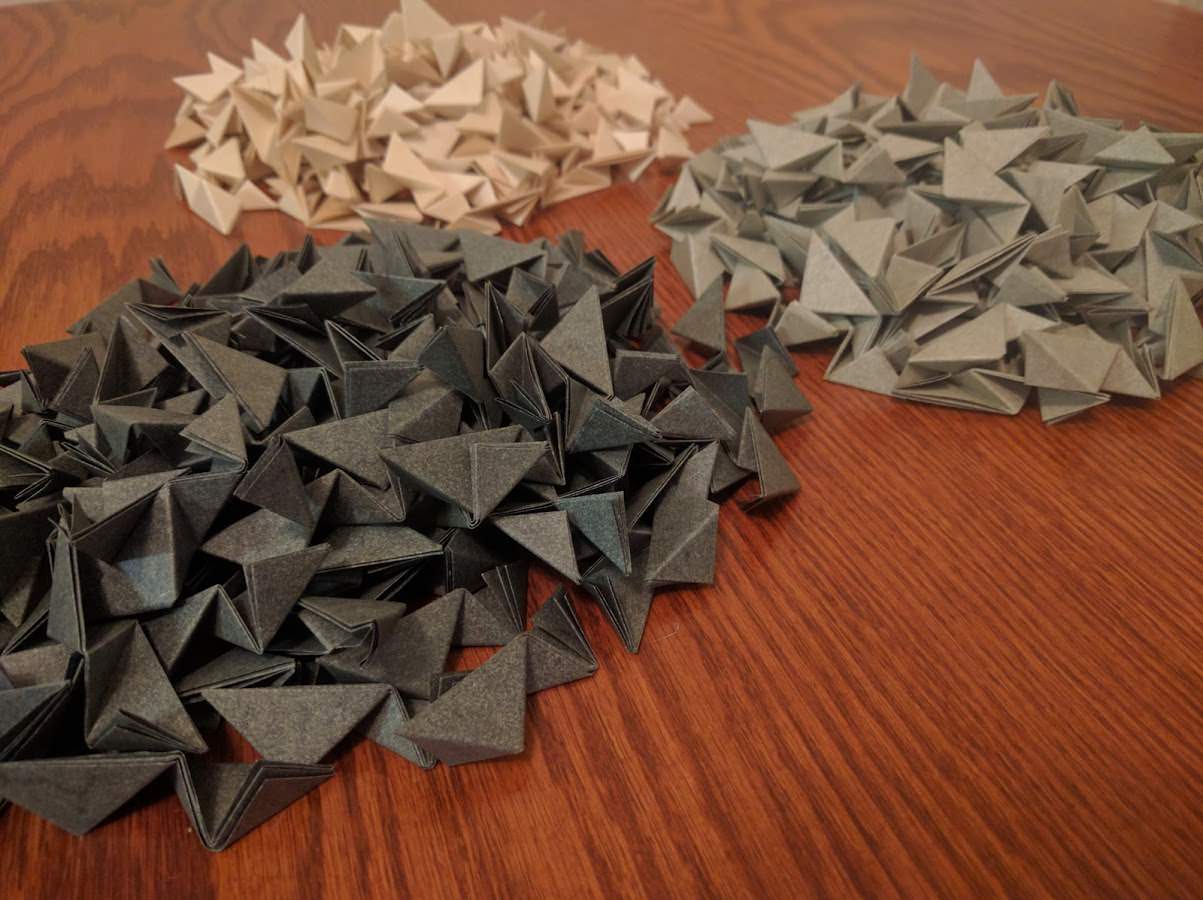 I used Zanders Elefantenhaut which is a book binding paper. It is relatively thick for origami but is really good for wetfolding, tesselations, or this sort of modular origami. It is nice and crisp, holds a fold really well, and doesn’t crack. It comes in 70cm by 100cm sheets. I needed 360 squares, 120 of each color. I used a big straightedge and an xacto knife to cut the squares.